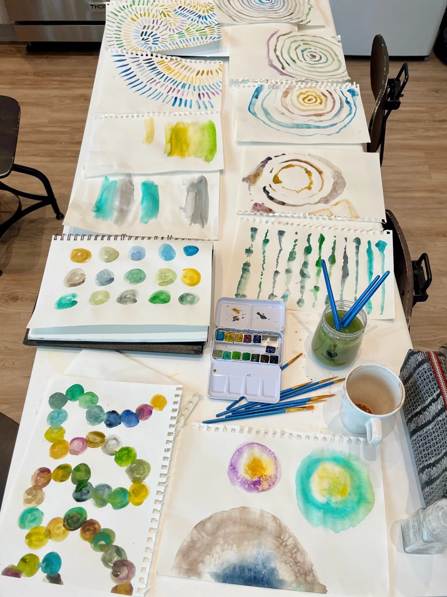 If your team is looking for a new experience we invite you to book our Power Watercolor Meditations offering. This experience is a powerful practice to elevate our moods. We will create emotive and expressive watercolor paintings. Our kits include a rainbow watercolor palette and pigmented inks, along with a watercolor journal to use as a place to paint for future meditations.